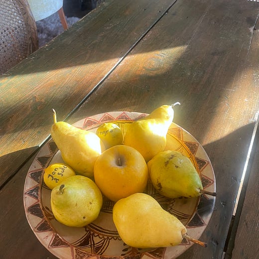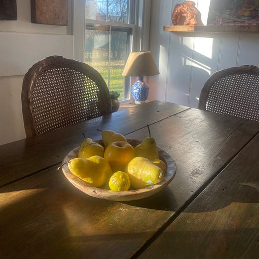 Hi friends! It’s Friday, which means it’s chorus-of-collective-gratitude o’clock! This week Jon and I traveled to London to attend screenings of American Symphony, and my dad joined us from Tunisia. He brought this beautiful plate as a gift, and my mom included two little lemons from the tree near their house in Tunis. She had written “Jon and Suleika” on one and “Congratulations” on the other. In true Anne style, it was bizarrely, beautifully creative—I mean, who picks two lemons and thinks to themselves, “Oh, the perfect card!” But it actually is perfect. By now the lemons are real inter