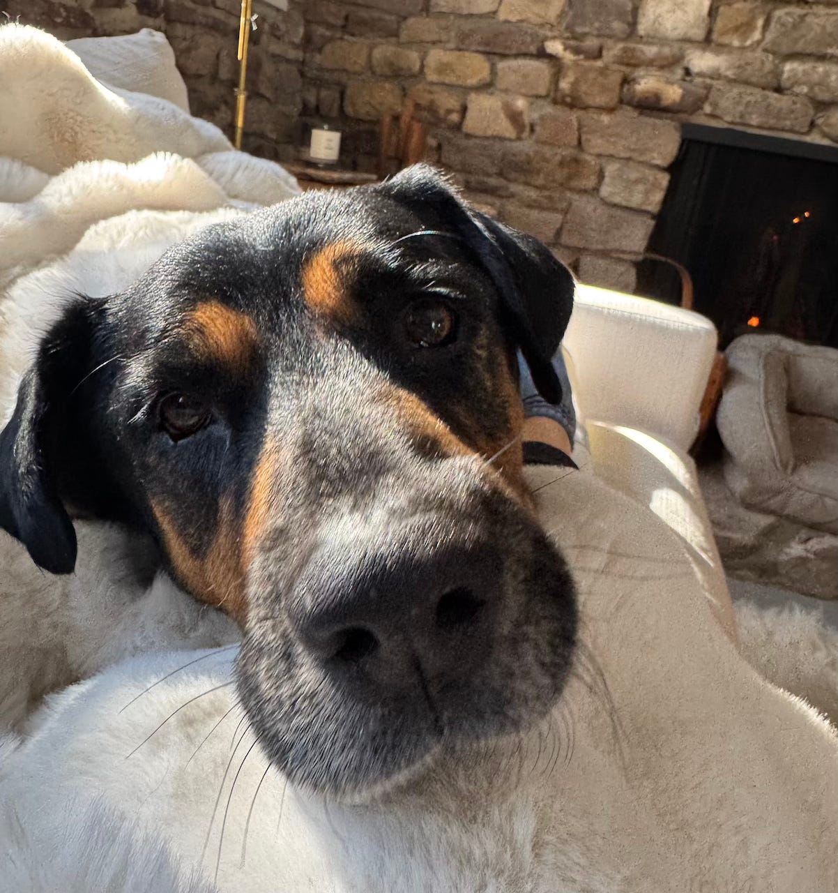And then, yesterday, Bob began to settle. He softened. When he first arrived, he was understandably disoriented, whimpering every time I left the room. As I write this, he’s curled up beside me, wrapped in the softest blanket I could find. He’s been asleep for hours, snoring deeply—like someone who’s been holding it together for years and has finally realized he doesn’t have to. As he waits to find a forever home, Jon has given him a name upgrade: Billy Bob Bo Bob Blanky Dank Batiste. Robert, for short.