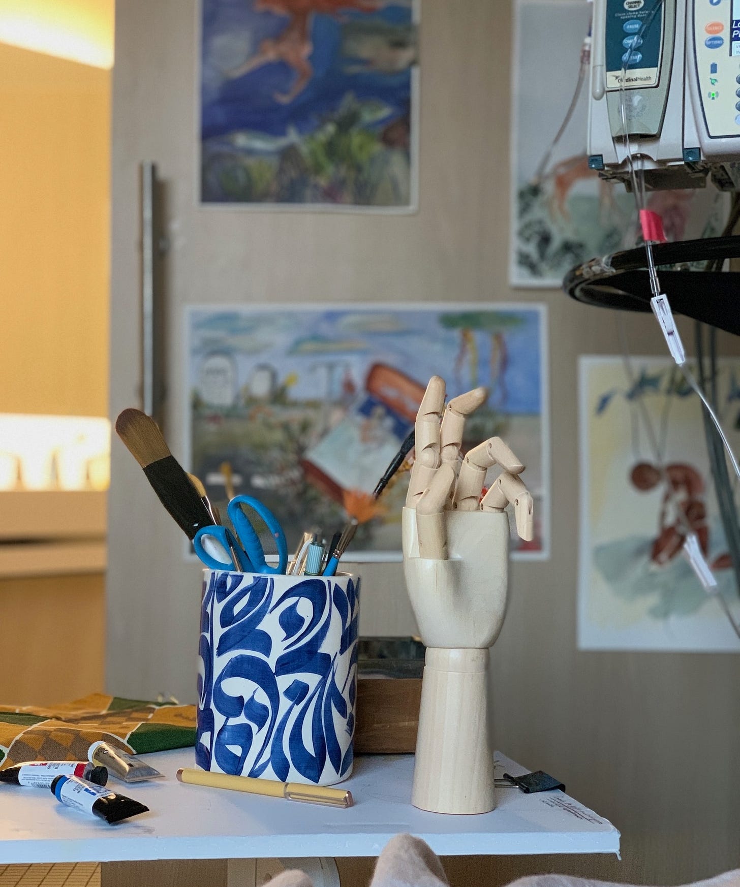 Experience had been a teacher. I didn’t bring tomes like War and Peace this time. (I still haven’t read it.) I left the yoga mat and resistance bands at home. Instead, I prepared for comfort and inspiration—cozy sweatpants, port-friendly hoodies, soft beanies, sheepskin slippers. I brought a stack of journals, my lifeline during the first transplant; a couple of Thich Nhat Hanh’s “How To” books; and an art book of Frida Kahlo’s work. At the last minute, almost as an afterthought, I added a small watercolor set and a few paintbrushes a friend had given me. I slotted it all into a gray felt diaper caddy. So tidy. So controlled.